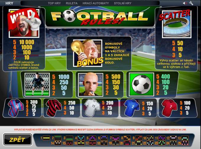 - Tabulka výplat— zde najdete všechny informace o herním automatu Football Rules.