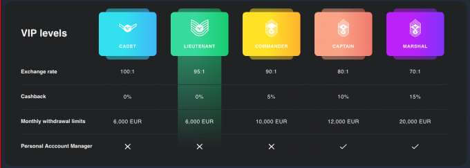 Casino nabízí i tzv. body za loajalitu. Čím více budete hrát, tím větší máte šanci na získání peněz bez jakýchkoliv podmínek (Cashback). Za každých protočených €100, získáte 1 bod. 100 bodů si můžete proměnit za €1. Casino k loajálnímu programu nabízí 5 různých hodností:- Marshal – za 70 bodů, získáte 1 euro (nejlepší hodnost)